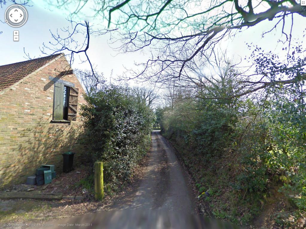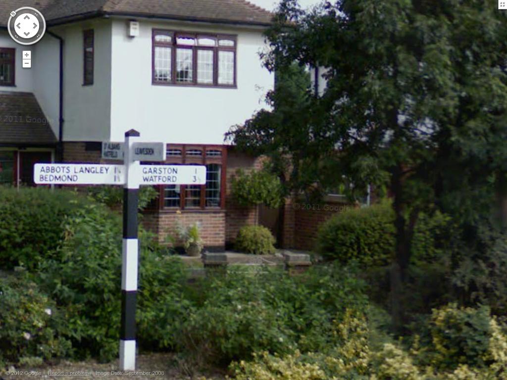 Following that it is a short walk up the street to the first true fields. For many decades there has been a very curious object just feet from the main road and I often wondered what it was. Sadly the very time I wanted to take its photo, it had been removed to make way for new housing adjoining the new WB Leavesden film studios and Harry Potter tour. Happily I found it on Google Street view below: