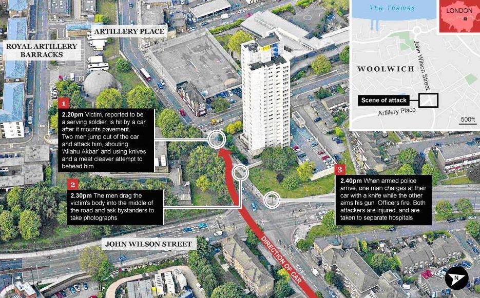 As it is a proud tradition of British police not to carry fire-arms, the local police who arrived in minutes waited for the special fire-arms unit to arrive a few minutes later. As soon the police cars arrived, the two men charged at the police leaving no option to shoot the first man carrying the butchers machete and then the second terrorist raised his gun he was shot two by a policewoman praised as being something like Robocop.