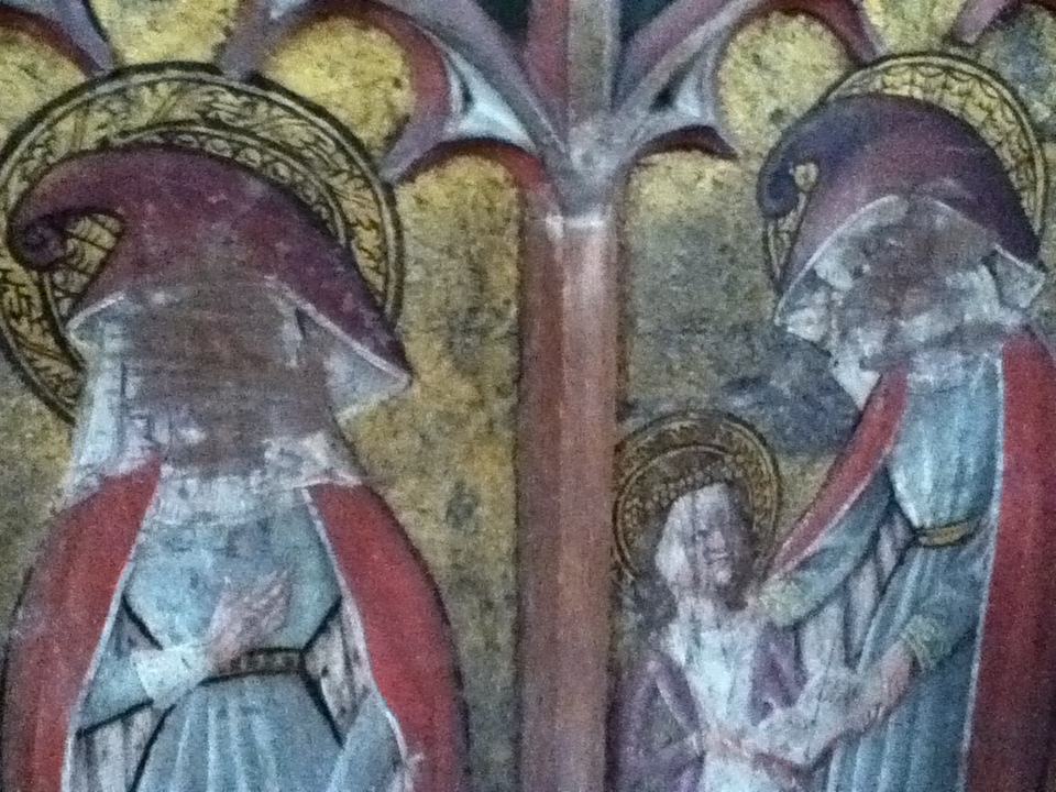 The puritans at the reformation scratched out the faces on these frescos and whit washed the walls to cover Catholic imagery.