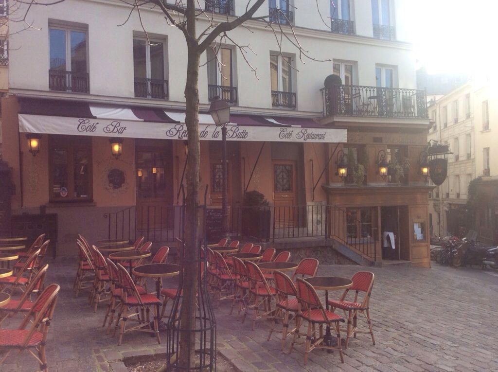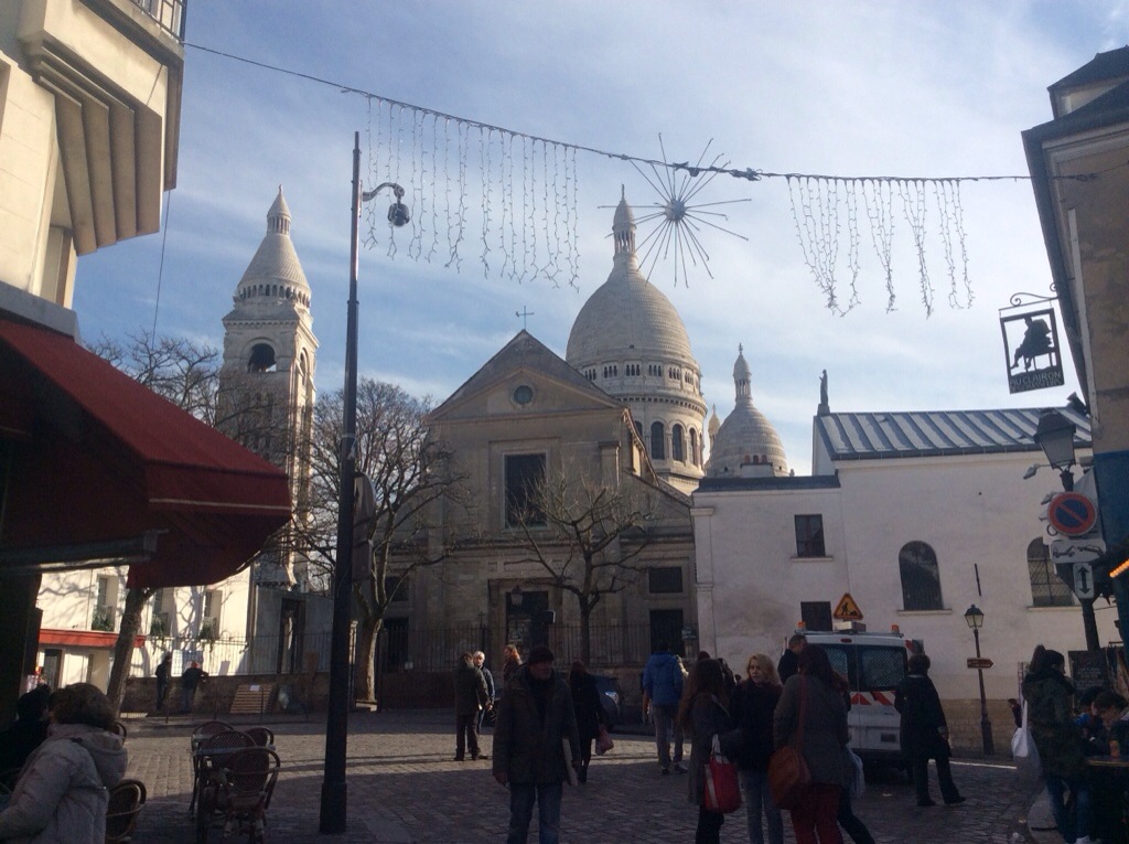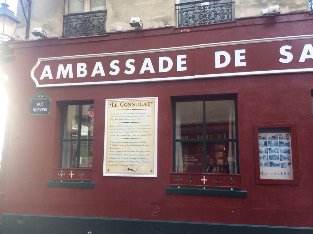 It was a good plan and it allowed us to tackle the steep hill in stages and without the crowds of the more traditional method. However, the church is on top of the hill and no matter which way you go, sooner or later you have to head upwards. This we did whilst both overtaking less laden pedestrians and pausing for breath on the pretext at looking through shop windows at the pretty displays. Our higgledy-piggledy route also had the advantage that I discovered a new and extremely beautiful and village-like area close to the Sacre Couer. Narrow cobbled streets with cafes, bars, restaurants and tourist shops in equal measure. It was the typical picture-postcard image of Paris and we stopped at Le Consulate. It is an olde restaurant-bar and a place where many famous artists around the beginning of the 20th century including Van Gogh, Picasso and Monet amongst several others. Being there it is easy to see why, such pretty views, perfect light for painting and the feeling that any number of creative people could work their magic given a little time there. I felt at home and wondered how many of them had once stood where I do now. A big part of me wished I could be there with them, rather like the Woody Allen film where a tourist ends up going back in time every evening whilst in Paris to meet some of the great names of the past.