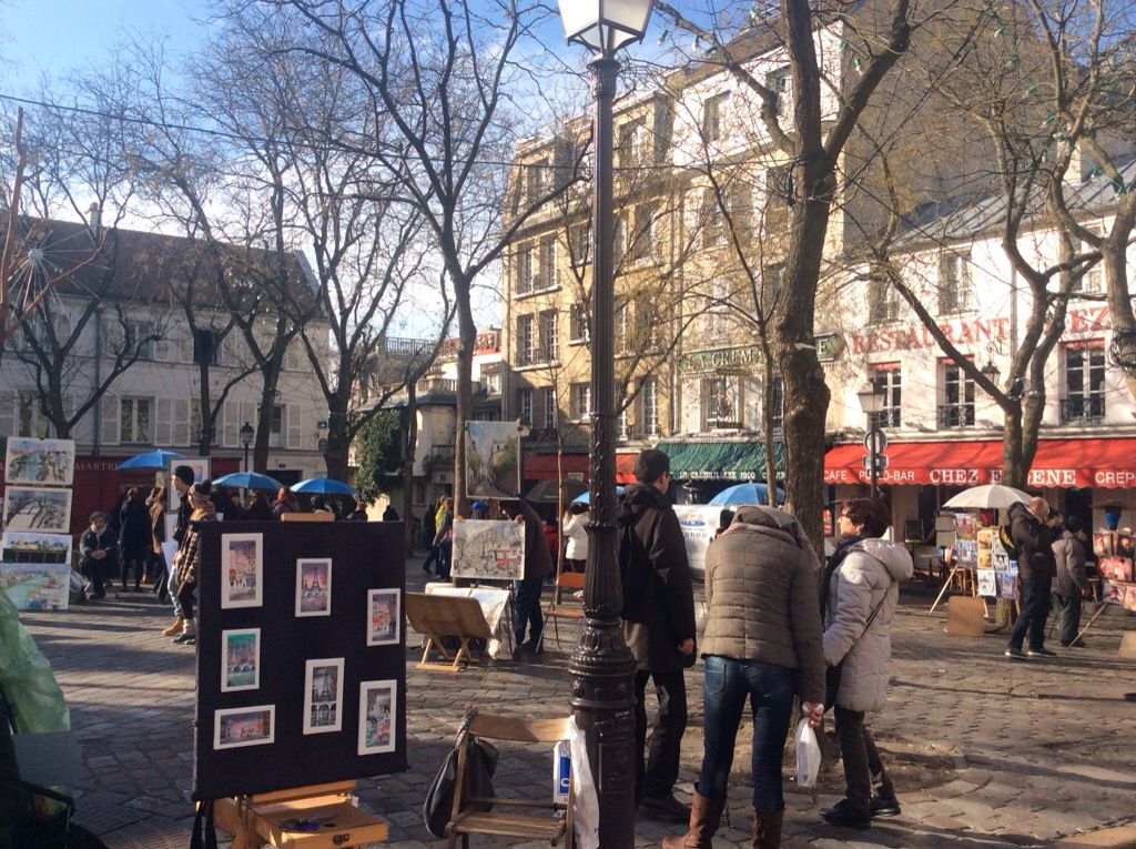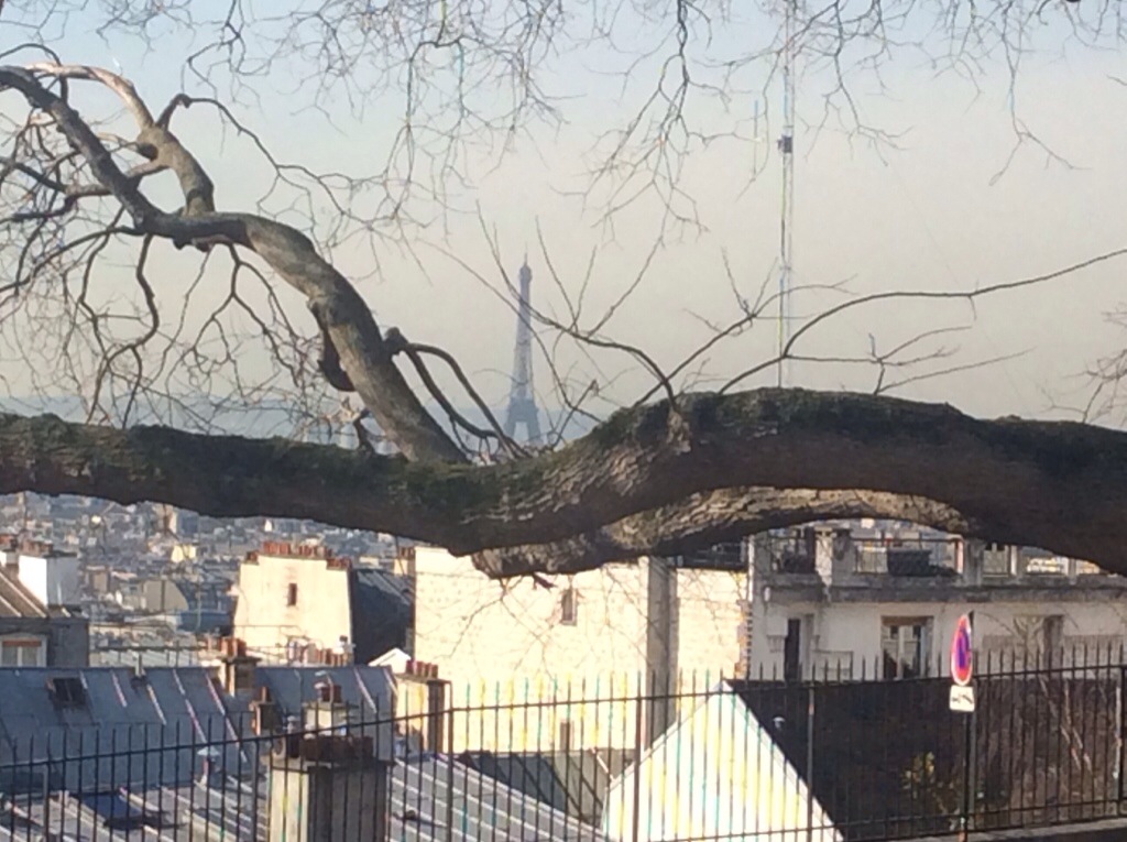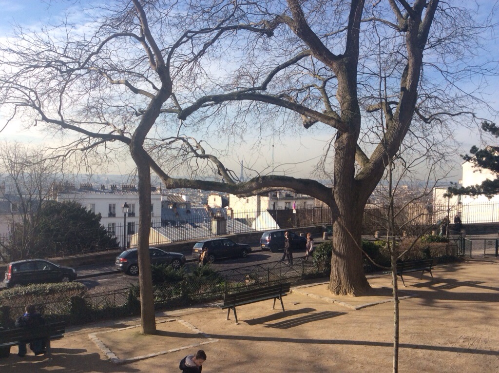 We found ourselves looking out over Paris through the tall bare leaves of some mature trees in a tiny park. The Eiffel Tower could be seen in the distance along with several other places we had seen. Wow, we had walked A LOT. It was warm and sunny, well warm in an early February sort of way so we stayed and enjoyed the views.