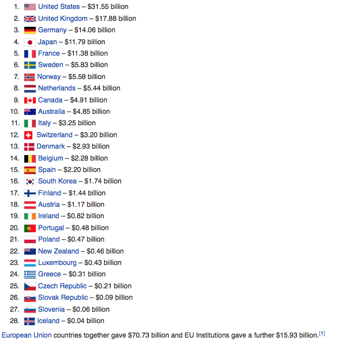 Lots of people only go my the value of donations but the only fair way is to go by the GDP which is why tiny Luxembourg ranks so highly as even though they are tiny, they give a much higher percentage of their total than giants like the USA, Japan or Germany.