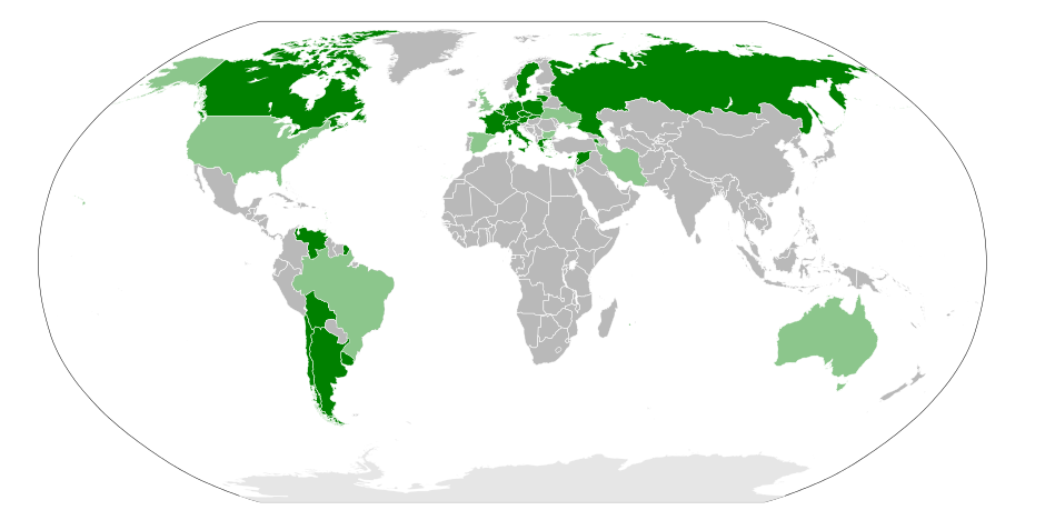 Nations that recognise the Armenian Genocide. Dark Green areas have officially recognised it whilst light green areas have major political or national groups that recognised it .