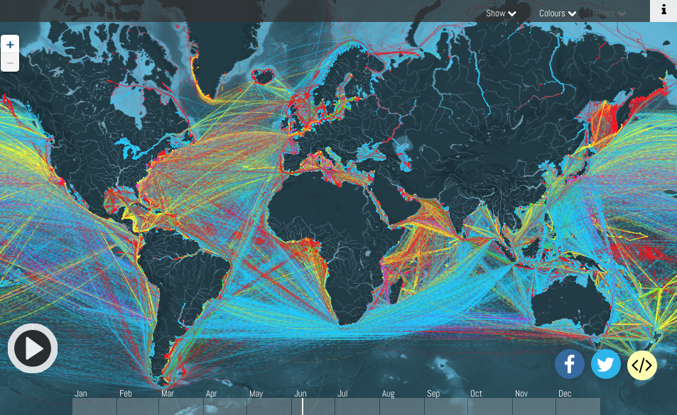 Colour coded cargo ship traffic around the world