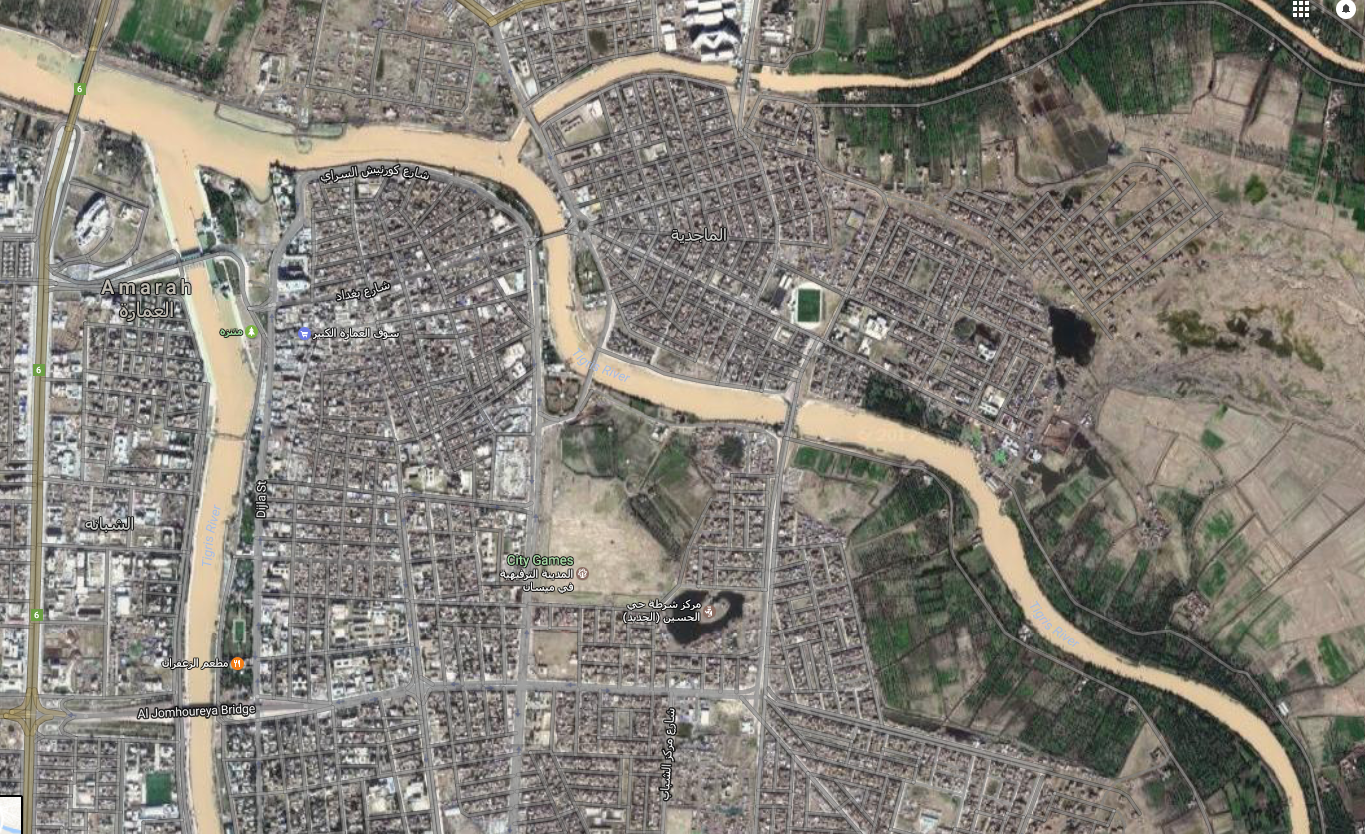 screen-shot-2017-01-25-at-10-03-43 Amarah from space. Dominated by the River Tigris which branches off in numerous directions here on the way to the sea. The cemetery is the largely blank square in the centre of the photo.