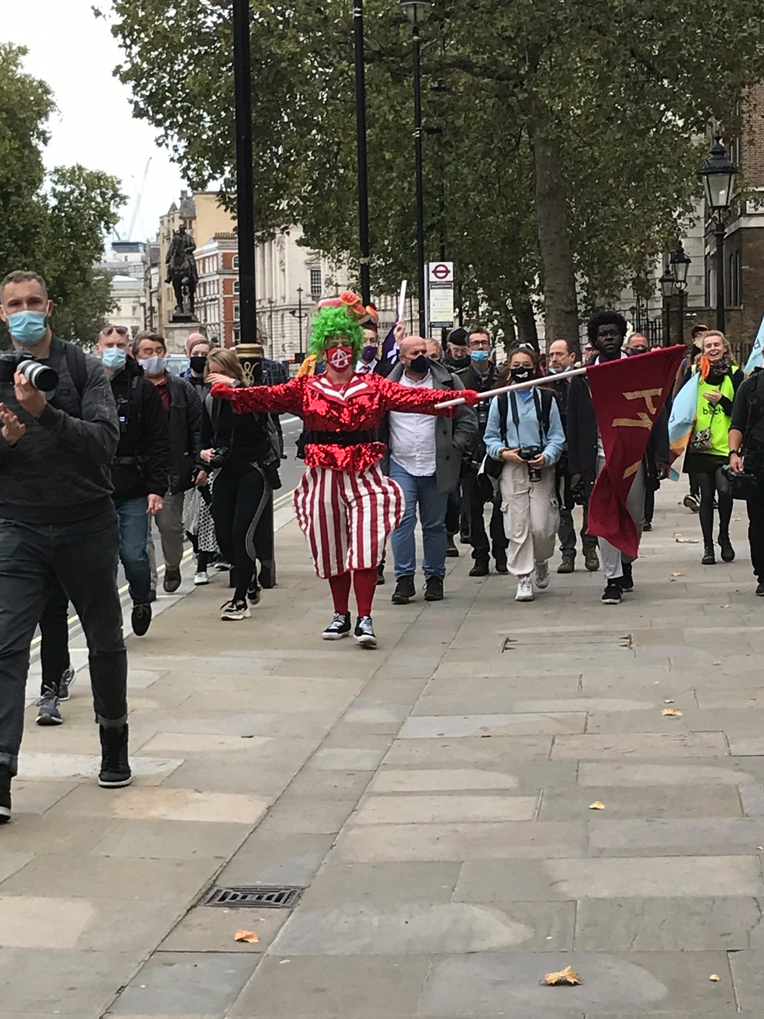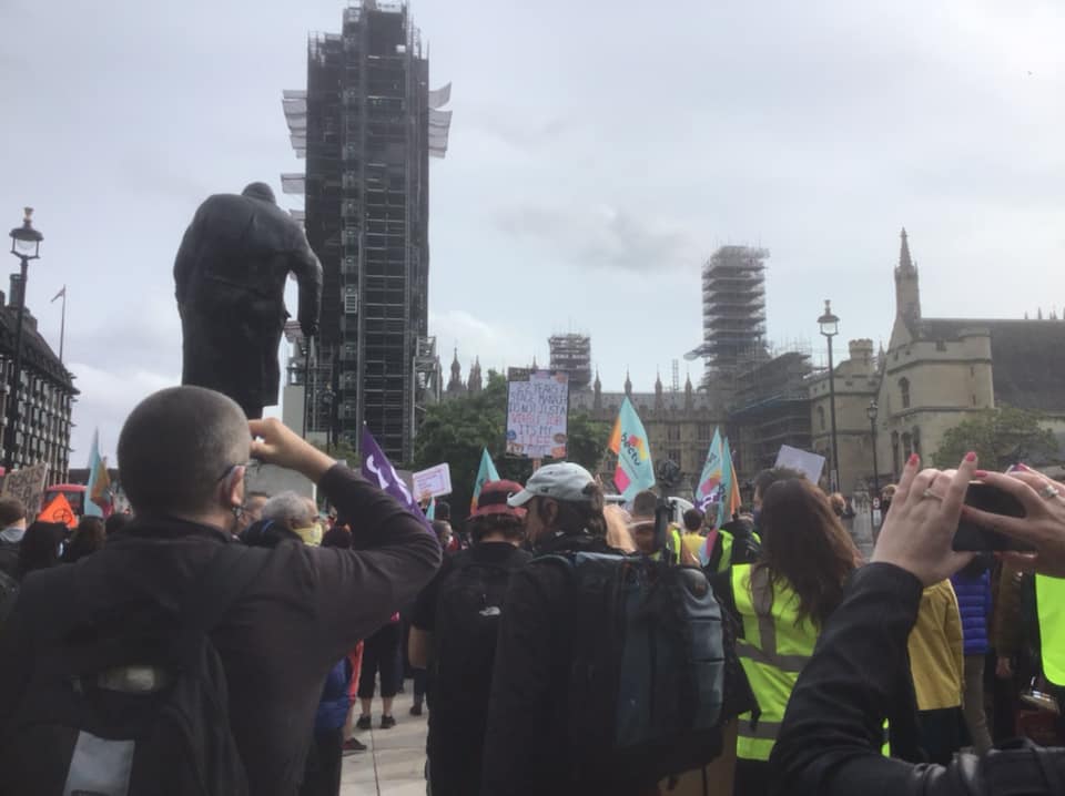 The drums were being bashed, dancers were pirouetting down Whitehall and flags were being waved as we socially distanced our way in a long snake to Parliament Square. I heard more than one Police office say that we were the best organised and most law-abiding march for a long time which probably says a lot about us and our cause.