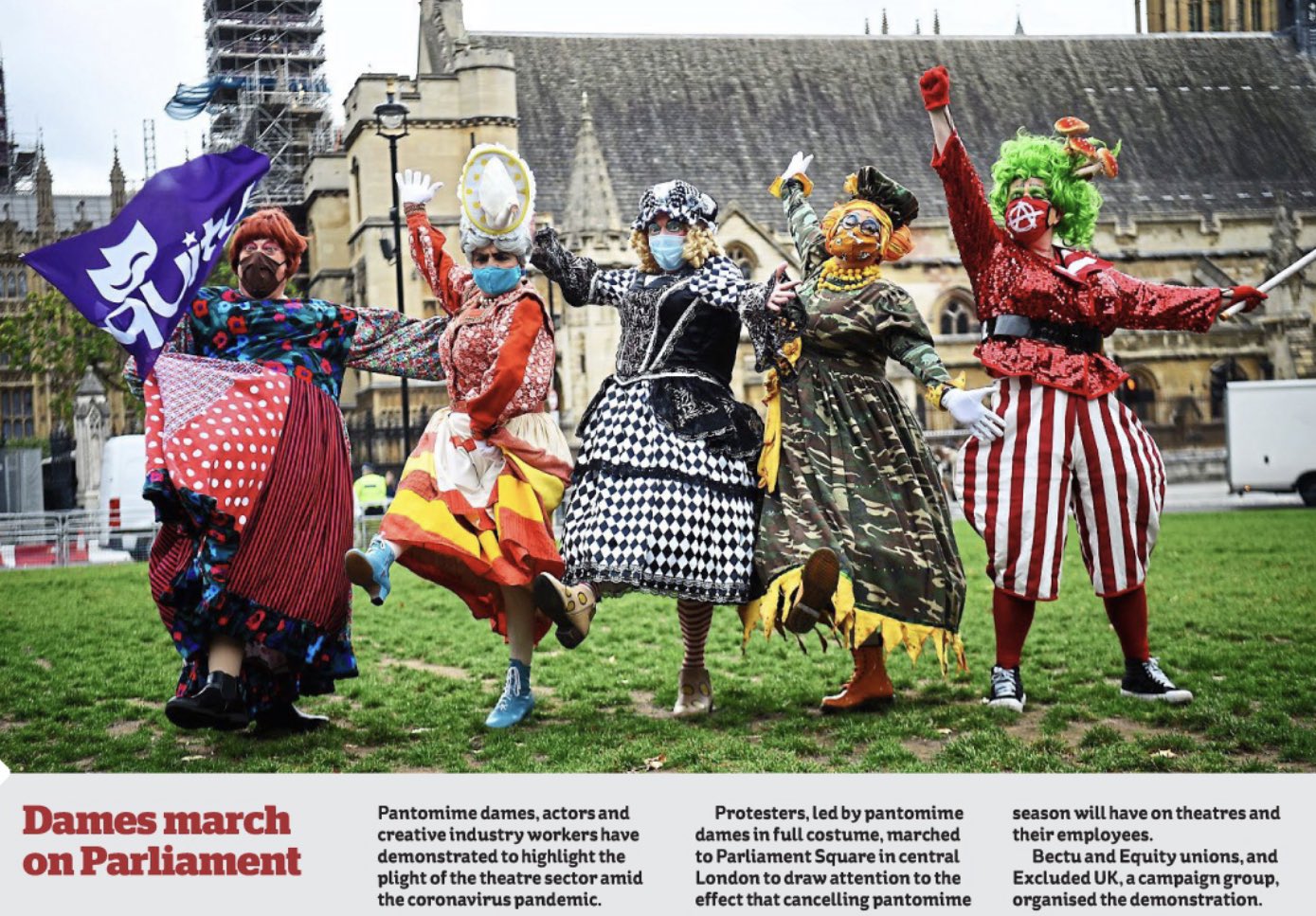 And yet despite our suffering we kept our good humour and soon we had re-inforcements from groups acting unions such as Equity and Bectu. What an impact they had, a whole load of workers from Londons famous West End and theatres and cultural venues across the land. Pantomine Dames being incredibly loud and charismatic and attention seeking. For my foreign readers Pantomine Dames might be a very alien concept but they are often loud and big men who dress up in the most colourfully outrageous female outfits for special plays at Christmas time, known as Pantomines… very popular with families and children and a way to get them into the arts and financially very important to theatres in the winter months with fewer tourists.