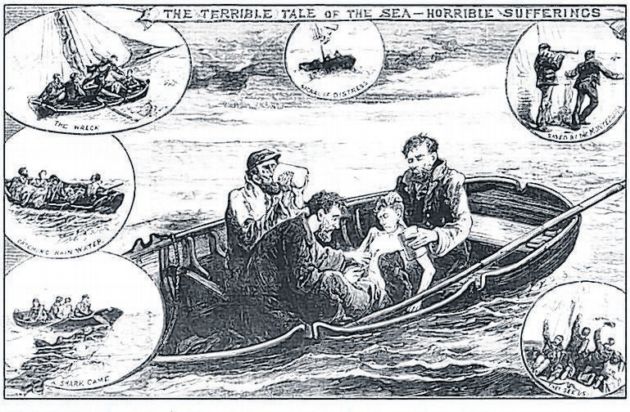 An 1884 illustration of the yacht Mignonette’s stricken lifeboat is pictured above
