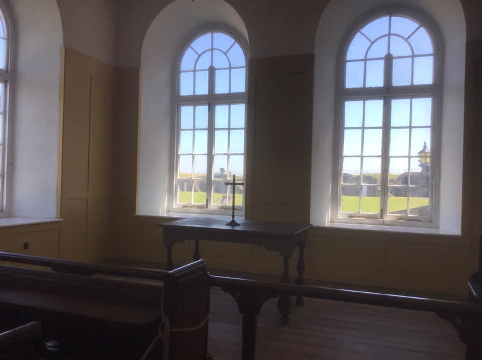 Even in a Georgian Fortress, religion had its place and Tilbury has a rather modest chapel near the front gate. There is barely any ornate decoration but the simple decor and large stylised windows being the altar and along one side make a big impact.