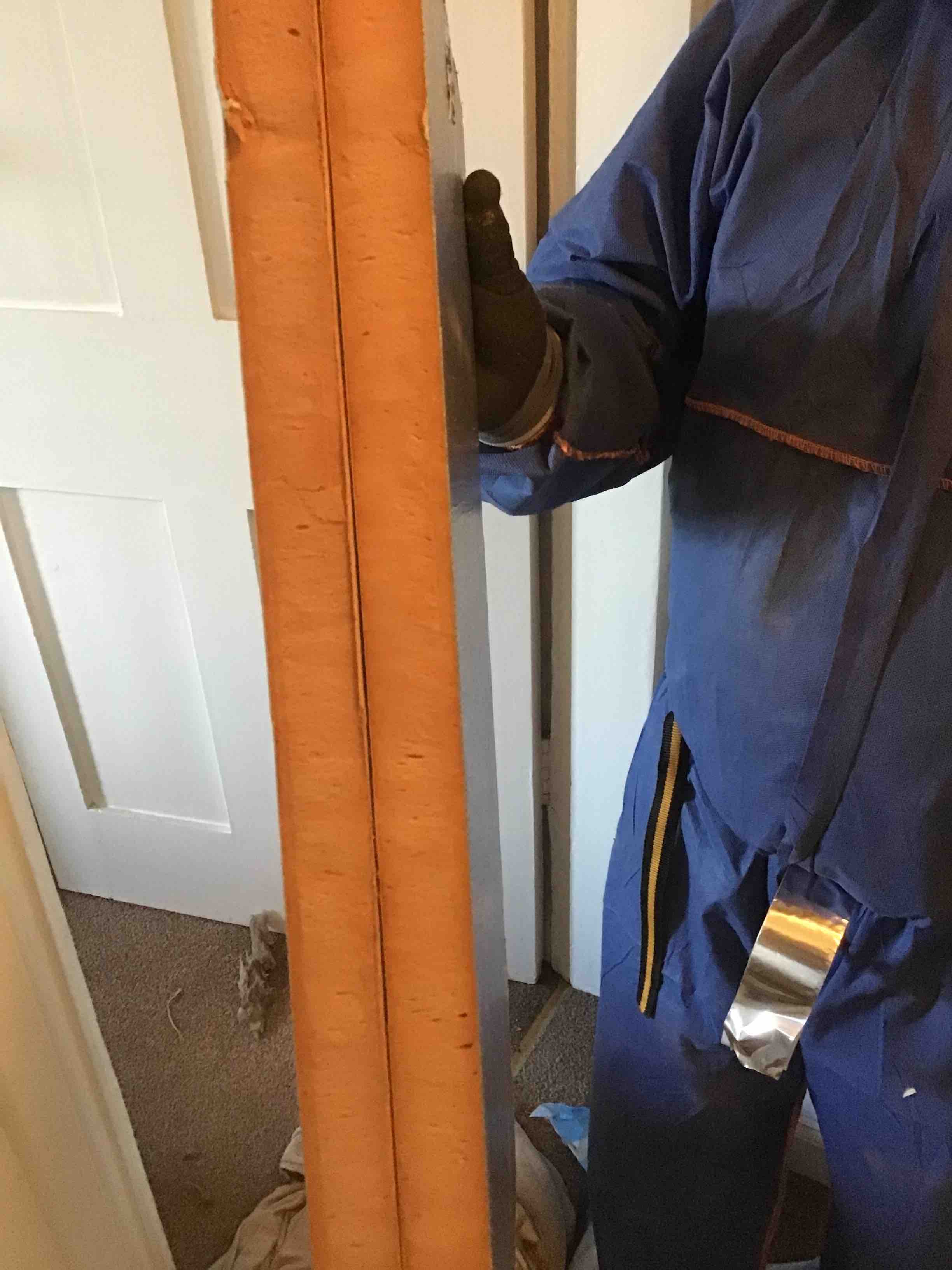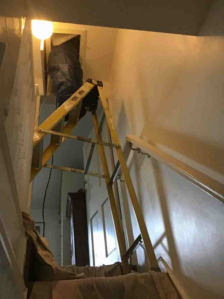 There are always known-unknowns and unknown-unknowns as Donald Rumsfeld once said and one of the known-unknowns is the tiny size of the Georgian loft hatch. As my landing is very small and on two or three levels even getting up open the hatch door is a challenge. Getting someone to fit through the tiny hole is another one. The insulation is too big to even fit through the hatch so it’s having to be cut into manageable portions in the back garden.