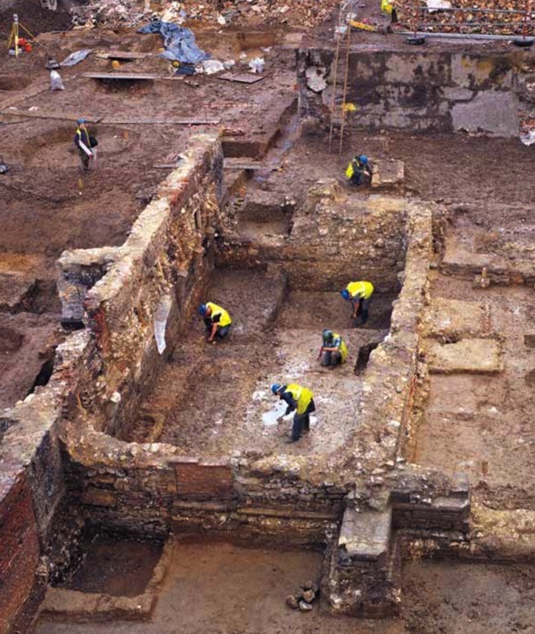 That old rotter King Henry VIII dissolved the Priory of St Mary Spital in 1540 and the bones were rather thoughtlessly disposed of before the building likely became a basement of kitchen for a large house. Eventually though, the main body of the house was levelled as Spitalfields developed whilst the section underground was filled in with debris, likely from the Great Fire of London. It was entirely forgotten about until its re-discovery in 1999 and the architects thoughtfully made a public feature of it and adapted their building plans accordingly.