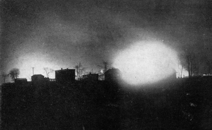 A few minutes before seven, on the evening of January 19th, 1917, people who happened to be out of doors in London noticed a vivid red glow in the sky in an easterly direction. Many of the people were standing at the doors watching the fire that had broken out, and not realising the terrible danger they were in. Suddenly there was a deafening roar, a fountain of flaming debris was projected high into the air and this spread out like a fiery rose, dropping death and destruction over the whole district.