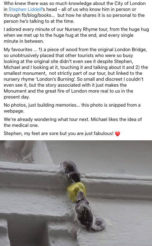 It was lovely to meet two Excluded tourists as we explored the places, origins and possible historical tie-ins for the nursery rhymes so many of us learned who we were young. Being very laid back and private, we went off at various tangents both geographical and interlectual so on top of nursery rhymes went from such disparate events as the London Bridge terrorists to smuggling, insurance scams in the middle-ages and biblical Abraham and the Epic of Gilgamesh (like you do!!)