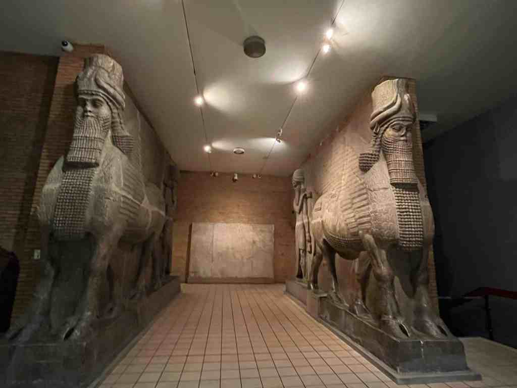 These are known as Lamassu or Shedu and once stood at the gates of the citadel for the Assyrian King, Sargon II (721-705BC) in the city of Khorsabad. Their features include a human head with the body of a bull with wings and they acted as powerful magic guardians against misfortune.