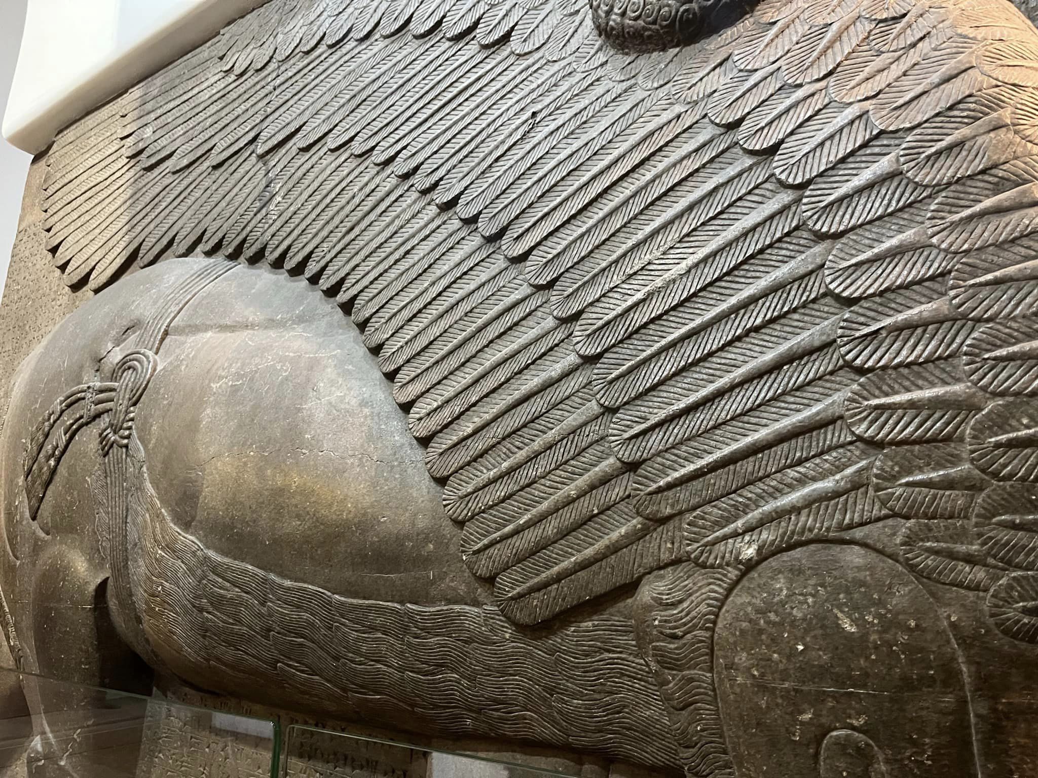 These are known as Lamassu or Shedu and once stood at the gates of the citadel for the Assyrian King, Sargon II (721-705BC) in the city of Khorsabad. Their features include a human head with the body of a bull with wings and they acted as powerful magic guardians against misfortune.