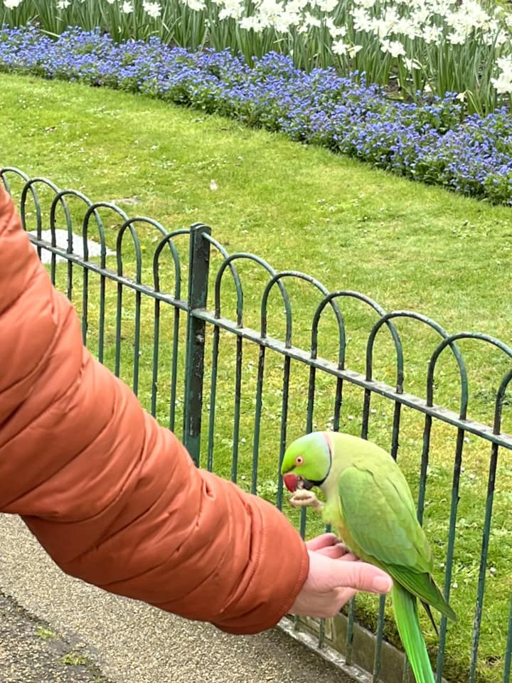 A few days ago I was giving a small Royal London tour and we came across a lady who was just finishing feeding the parakeets and she asked if we wanted to try. My tourists decided against it and in their defence, these parrots are wild and do have rather impressive beaks.