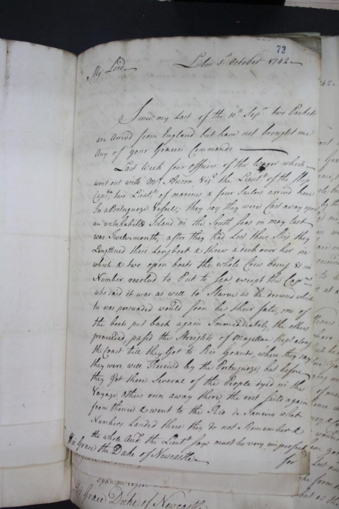 “Last week four officers of the Wager which went out with Mr Anson, viz the Lieutenant of the ship [illegible, Bulkley?], two lieutenants of marines and four sailors arrived here in a Portuguese vessel; they say they were cast away upon an uninhabited island in the South Seas in May last twelvemonth, after they had lost their ship they lengthened their longboat and threw a deck over her in which & two open boats the whole crew being 81 in number resorted to put to sea, except their Captain who said it was as well to starve as be drowned which he was persuaded would be their fate [this is a lie]. One of the boats put back again immediately [the barge], the others proceeded, sailed the Straights of Magellan, kept along the coast ’till they got to Rio Grande, where they say they were well received by the Portuguese. But before they got there several of the people died in the voyage, others ran away there [meaning Isaac Morris and others, this is also a lie]. The rest sailed again from thence and went to Rio de Janeiro, what numbers landed there they do not remember. The whole event the Lieutenant [Baynes] says must be very important for the sailors were become masters and would not suffer him to keep a journal. When they got to the Rio de Janeiro there were lots of their companions who left them at Rio Grande had been there & were gone away in His Majesty’s ship commanded by Captain Smith who sailed for the West Indies seven or eight days before they got in. The officers gone home of this Packet [HMS Stirling Castle] & the sailors are put on board His Majesty’s ship the Greyhound.”