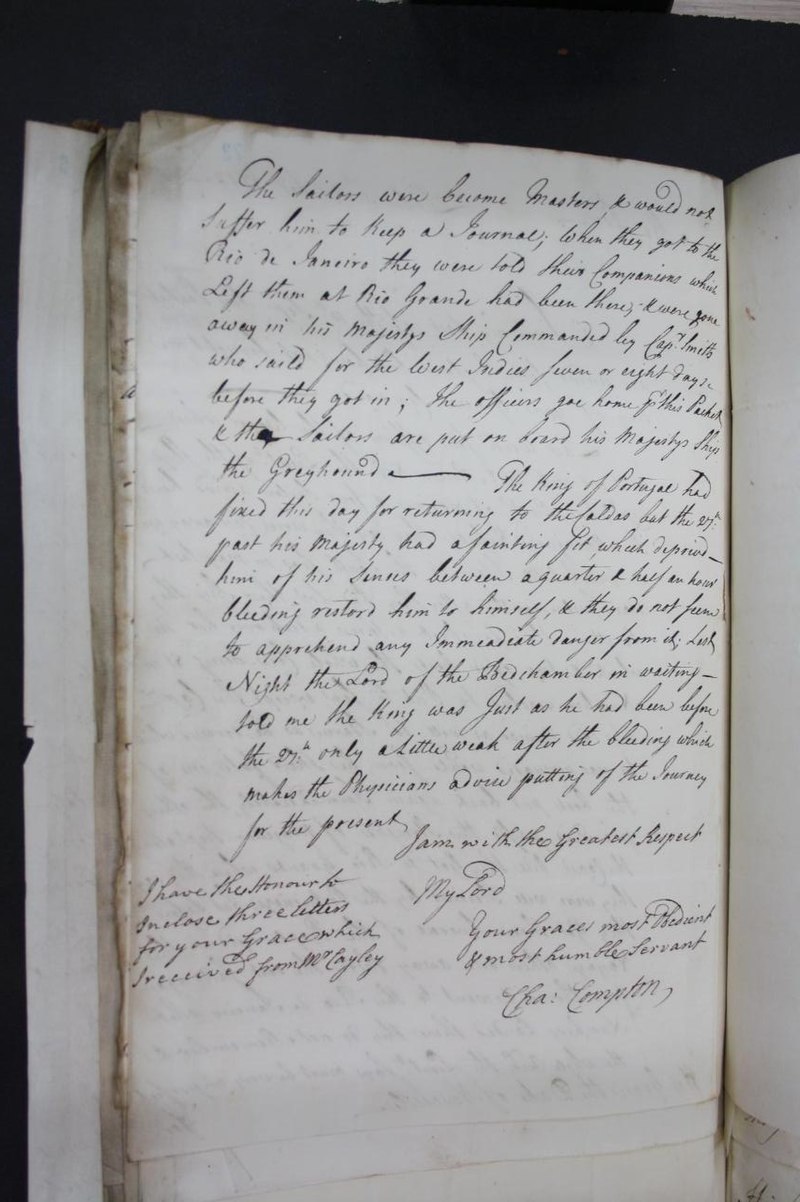 Stanley Walter Croucher Pack’s book describes a similar report:”Arrival of some of the castaways from the loss of H.M.S. Wager in the South Pacific. Were well treated by Portuguese at Rio de Janeiro, but sailors were mutinous against their officers. King of Portugal has had another seizure and his departure for Caldas is postponed… etc.”[