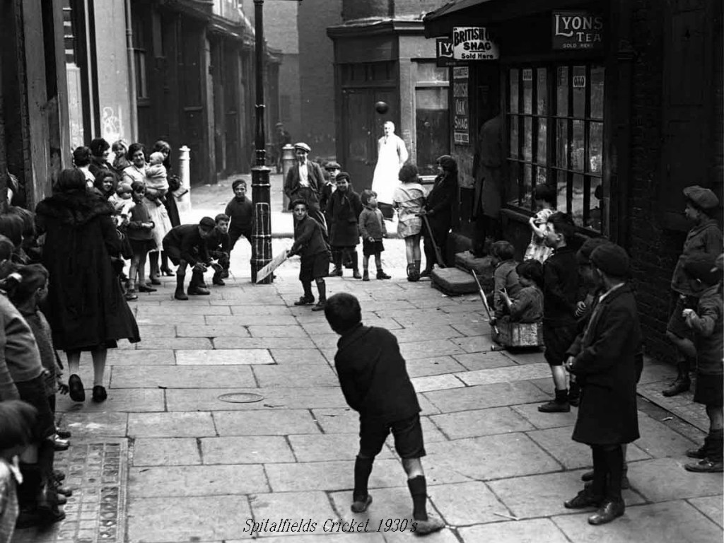 A few days ago I came across this marvellous old photograph from Spitalfields and I thought how marvellous it was. Young children making the best of things despite likely not having much money. Here they are playing cricket in the street much as we used to do albeit in perhaps better surroundings.