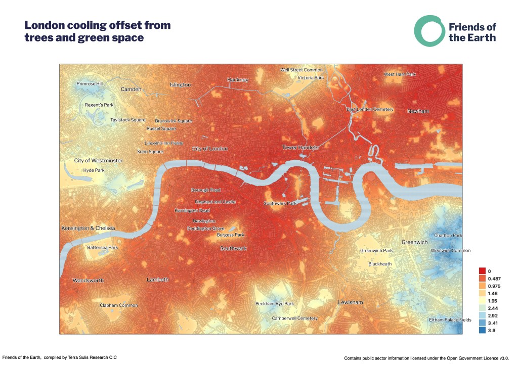 The map, created by climate organisation Friends of the Earth and map experts TerraSulis, is the first time the cooling ability of green space and trees in urban areas has been properly visualised.