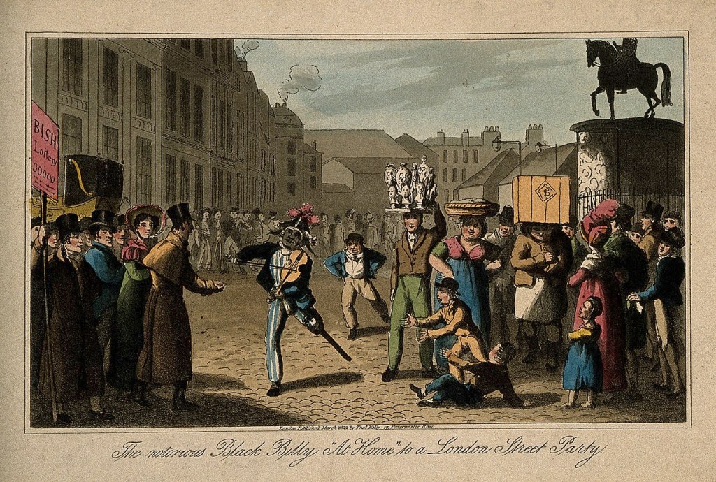 He sang and danced while fiddling and made use of his wooden leg to perform “peculiar antics” – pivoting on it, kicking it out. An engraving, “The Notorious Black Billy at Home to a London Street Party”, shows him in action flanked on one side by well-to-do citizens, on the other by children and tradespeople. A white youth mimics his steps.