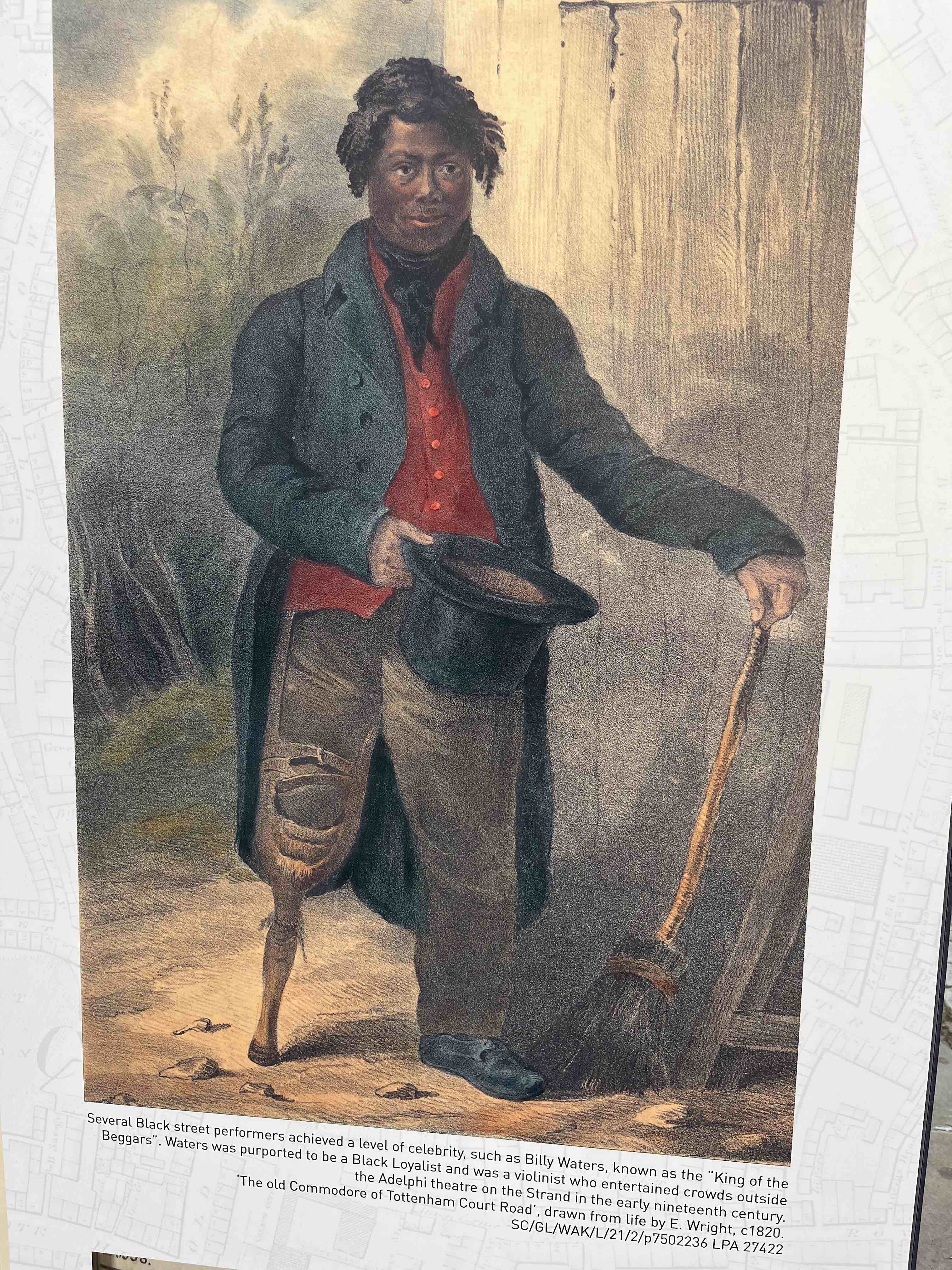 If you’re able to read the text below, the painting of the Old Commodore of Tottenham Court Road, you might see it mentioned that he is a British Loyalist. Given the time-period this would mean he was someone loyal to the Crown rather than the American Revolutionaries. Such descriptions relating to a black British person usually means though that they somehow escaped slavery and servitude.