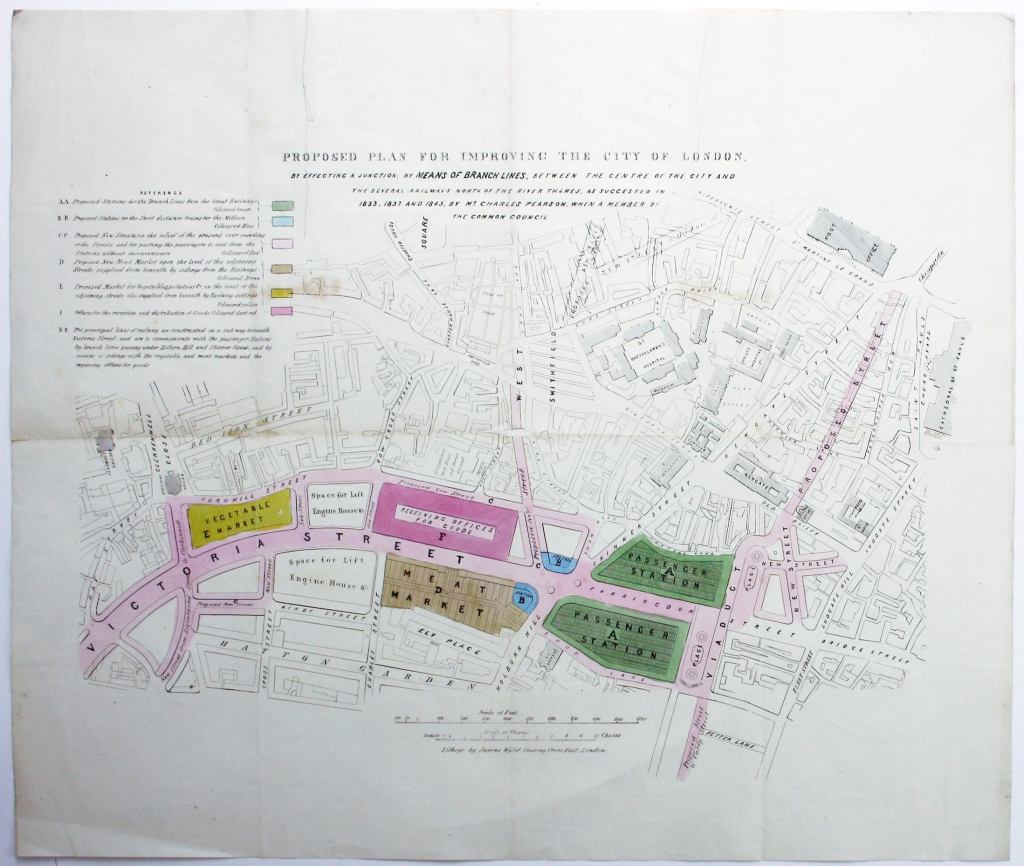 In 1846, Pearson proposed with the support of the City Corporation a central railway station for London located in Farringdon that was estimated to cost £1 million (approximately £103 million today). The station, to be shared by multiple railway companies, was to be approached from the north in a covered cutting 80 feet (24 m) wide.