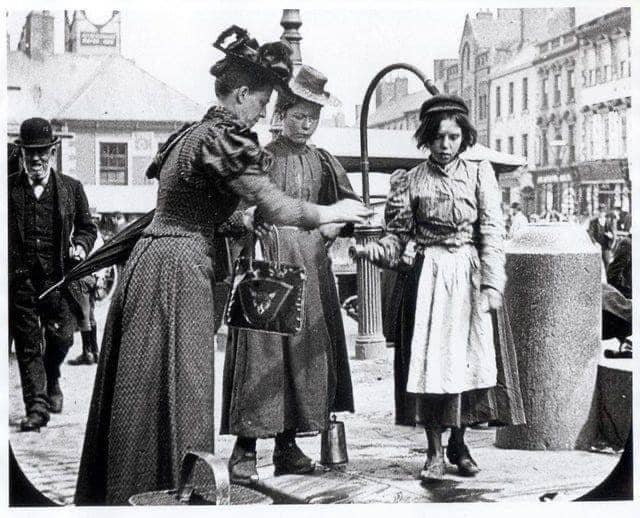 Saw this old photo from 1895. A Victorian service fair. The young lady is having a coin placed in her hand to confirm she is employed.