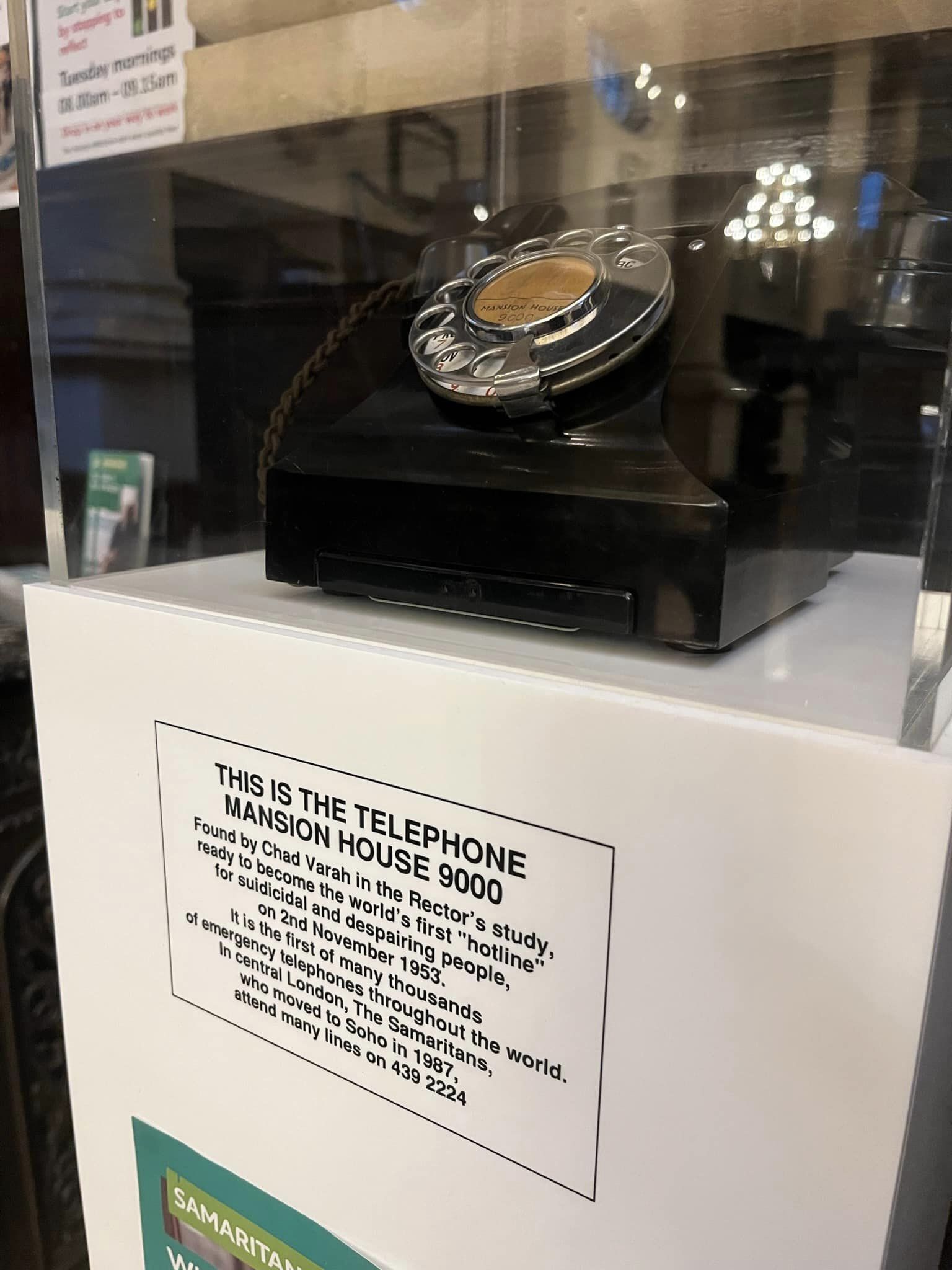 If you happen into St Stephen Walbrook then just inside the main door on the right hand side you can see the original telephone which Chad used when he set up the Samaritans.